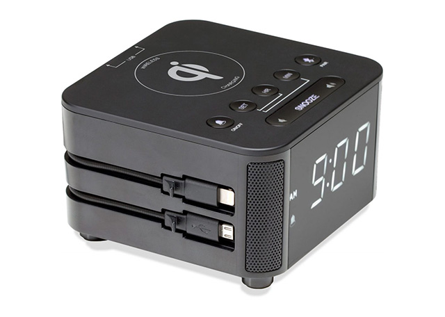 1. 可供六台设备同时充电,内置苹果Lightning充电接口,30品苹果充电接口和微型USB充电接口 2. 2个USB接口 3. 充电线可升级替换 4. 可自行添加安全固定栓,贴心放心 5. 蓝牙无线音乐 6. 闹钟功能 7. 带无线充电功能